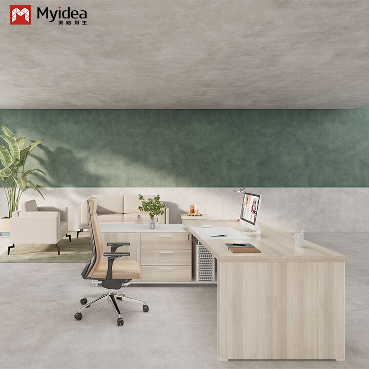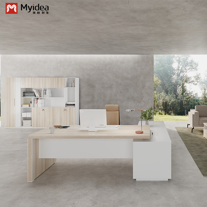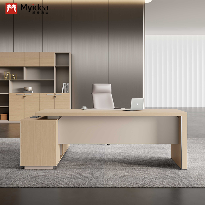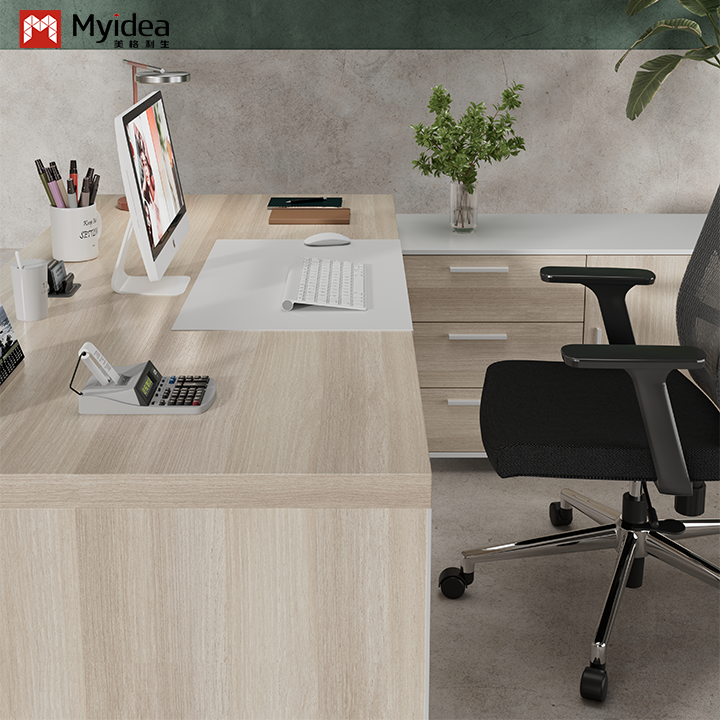 Myidea Solid Wood L-Shaped Executive Desk with Sub Cabinet and Aluminum Alloy Edge-covered Feet for Office Building