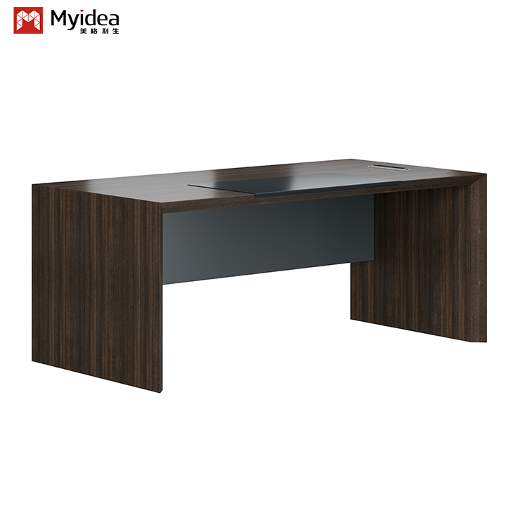 Темно-серый офисный стол для кабинета руководителя. Вспомогательный шкаф для хранения изготовлен из утолщенной меламиновой плиты